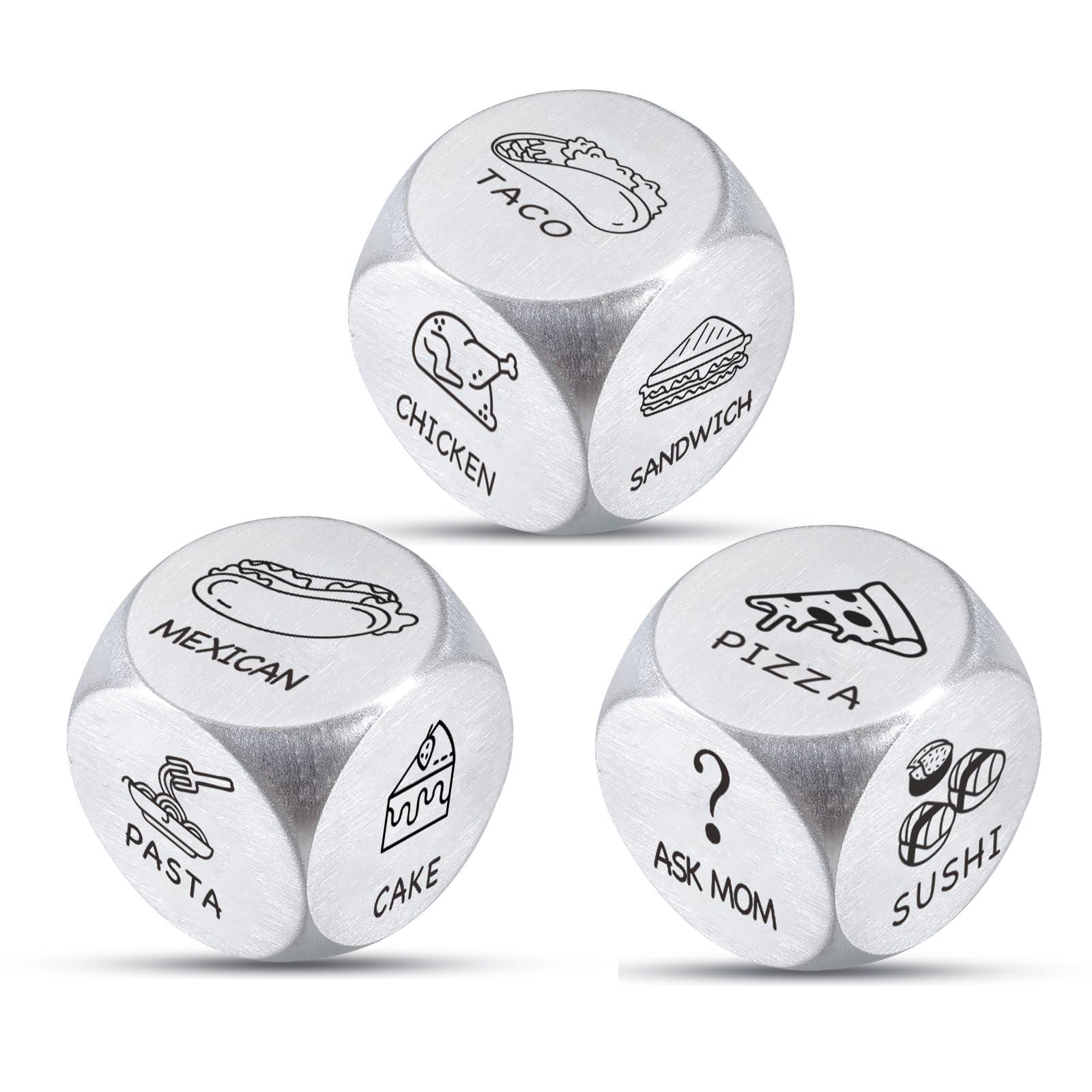 • Food Dice Decision Game: Couldnt decide what to eat? Let the dice decide, which includes eighteen food choices: pizza burgers chinese ask mom sushi seafood mexican pasta steak curry cake leftovers fish sandwich rolls thai taco chicken. It is funny food dice game for couples, food decision dice for couple, 11th-anniversary gifts for him her, anniversary steel gifts for men women, food dice set for wife Husband, boyfriend gifts for birthdays from girlfriend, date night gifts for couples.