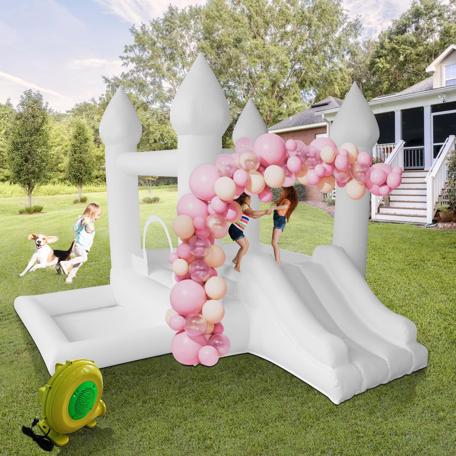 - Funny and SafeOur castle has slides and extra bobo balls for you, add fun to your play. The bounce zone is soft for young kids and safety with the protective net. Our white bouncy house comes with a powerful blower that inflates it in just 1-2 minute.