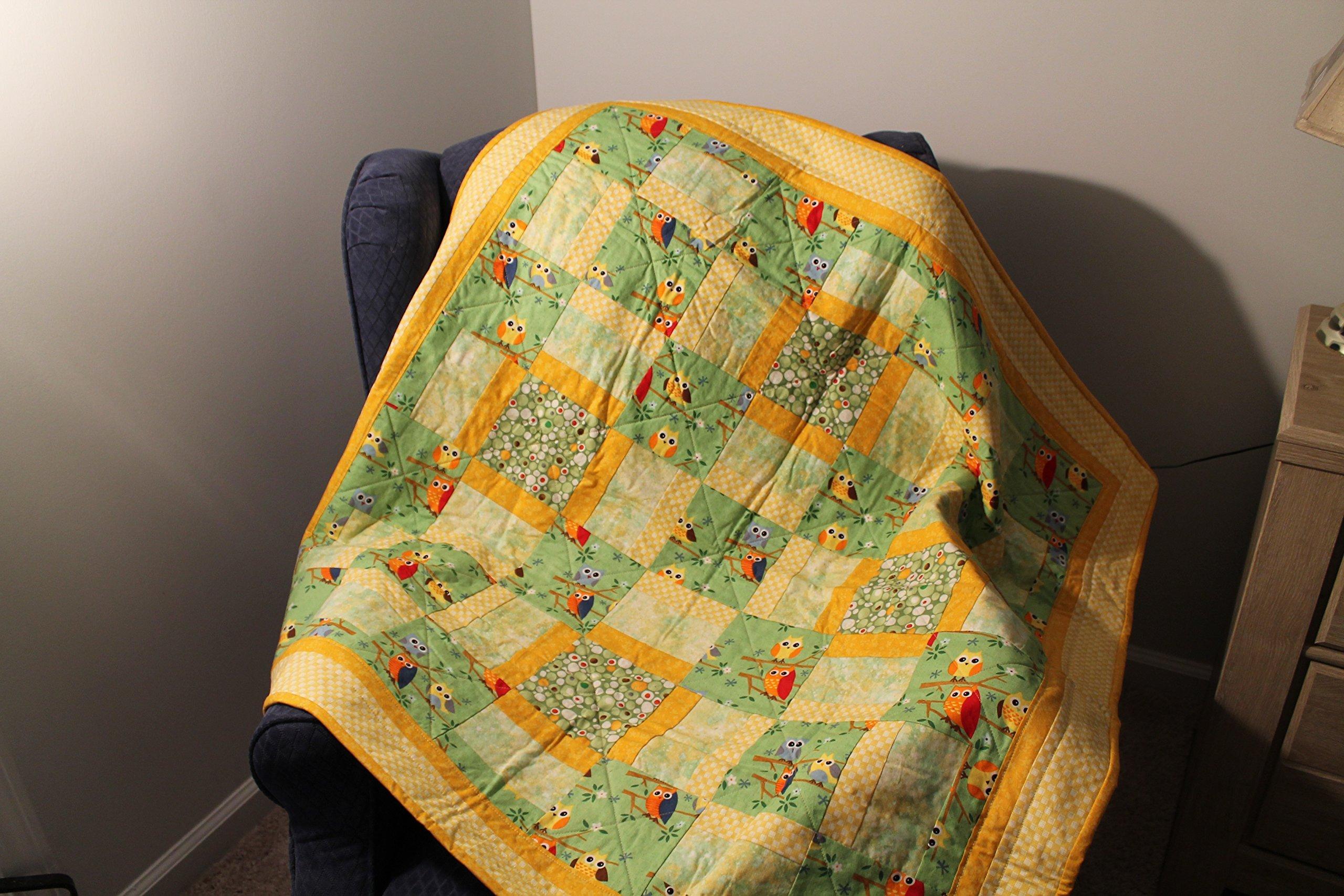 Yellow and Green Owl baby quilt. Measures approximately 42 inches by 42 inches. Made of 100% cotton. Machine wash and dry.