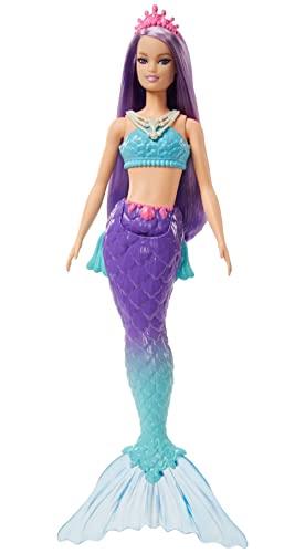 Make a storytelling splash with mermaid dolls from Barbie Dreamtopia! This Barbie mermaid doll inspires royal adventures and under-the-sea storytelling with a rainbow-bright look, seashell-inspired bodice and multi-colored ombre tail. Purple fantasy hair and a royal tiara complete her sea-inspired look. Bend Barbie mermaid doll at the waist to "swim" in the sea or sit and shimmer in the sun! With vibrant looks and fantastical details, Barbie Dreamtopia mermaid dolls inspire endless fairytale storytelling for kids ages 3 years old and up. Each doll sold separately, subject to availability. Doll cannot swim or stand alone. Colors and decorations may vary.