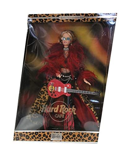 Hard Rock Cafe Barbie doll wears a lacy black cropped camisole, black vinyl flared pants with a red flame and guitar print on the bottom of the pants, a silvery studded and chain belt, and a faux leopard floor length jacket with red curly plush at neck and bottom of sleeves, lined in red. Accessories include a choker and a silver chain with a pendant, black boots, and a belly tattoo as well as a rhinestone in her belly button. Her earrings are large silver hoops and her sunglasses have blue tinted lenses and a golden frame. She also has a non-working electric guitar that has a red marbleized finish and a Hard Rock Cafe logo. Her blond hair features reddish brown highlights.