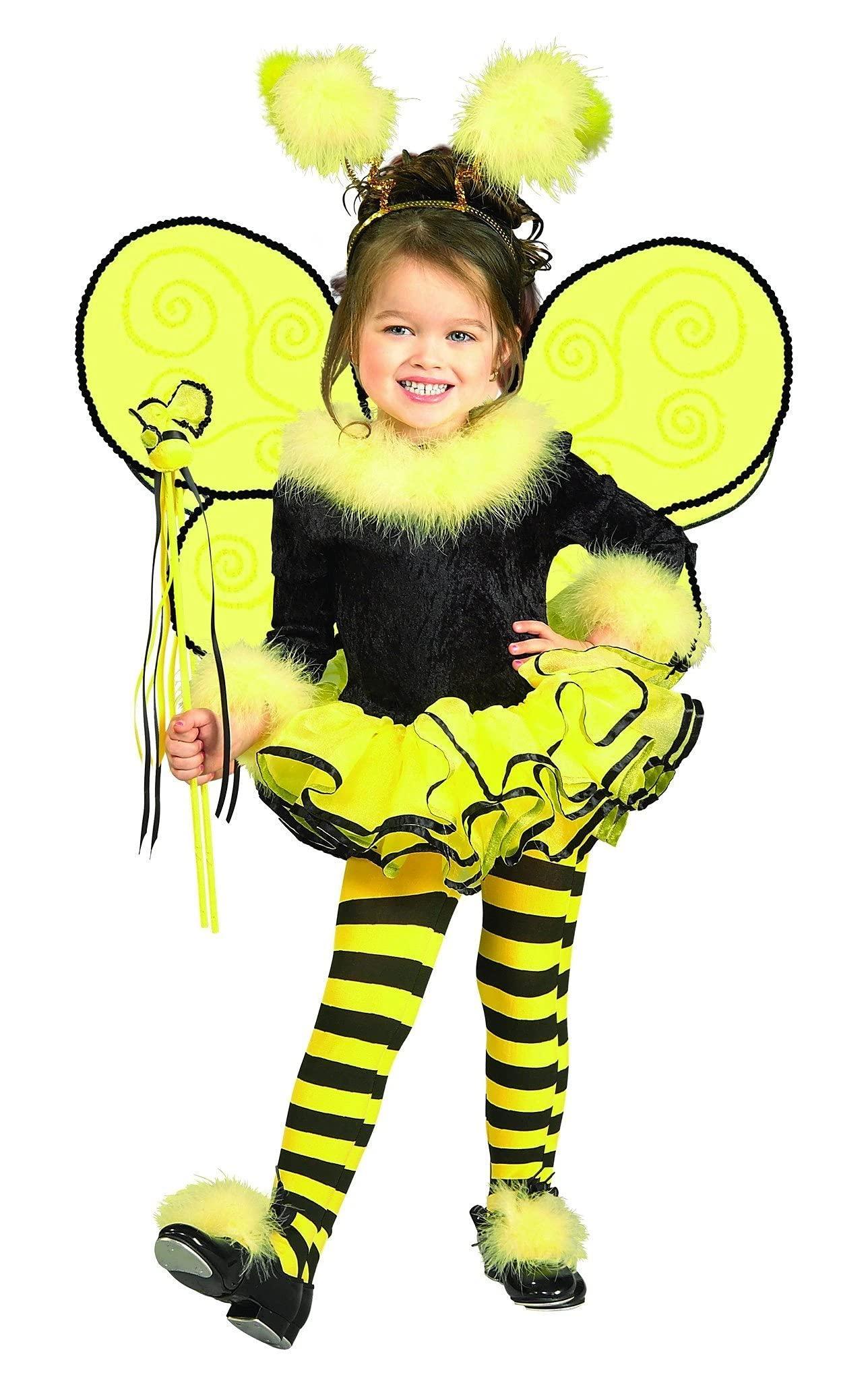 Buzzing around a garden you'll find cute little striped bugs looking for some pollen. With what they get from flowers they go back to their honeycombed hive to make the most tasty treat nature has ever created, honey. Now your tiny tot can buzz around the neighborhood collecting candy this Halloween in this bee costume! - Leotard w/Tutu - Headband - Wand - Wings - Shoe Puffs