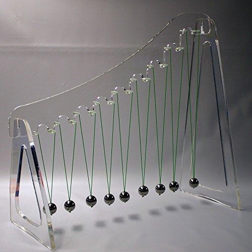 With a series of 25mm steel balls evenly spaced out and each one suspended from a curved acrylic beam by varying lengths of line, the pendulum wave is a captivating demonstration for all ages of students. Nine balls in total hang from the beam, and when pulled back and released simultaneously by the initiator stick, will swing back and forth to form a wave pattern and cycle through different phases at they visually simulate different phases, beats and frequencies due to the varying lengths at which they are suspended.