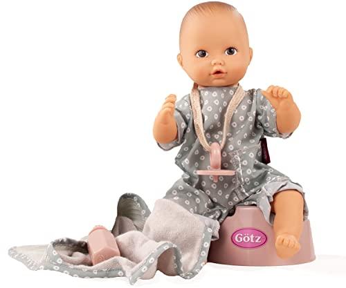 Little Aquini looks very clever in her chic summer outfit. She would love to go swimming again and splash around. She loves this so much that she even forgets how thirsty she is. When taking a water break Aquini snuggles into her cozy towel with hood and drinks and drinks and drinks. Be quick and sit her on the potty. Be sure, little Aquini will fall asleep with the pacifier in her mouth. Our 13'' tall Aquinis are baby dolls who can drink and use the potty. For this, just hold the bottle into the water upside down and press it slightly. It will fill up with water and you can feed your baby. Then your little one will have to go potty. Aquini girl has painted, brown eyes. For over 60 years, German-designed Gotz dolls have been known for their superior quality and durable craftsmanship, to become a child's favorite playmate. Their endearing faces and expressions speak directly to every doll parent.