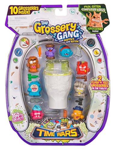 Product Description\n\nThe Grossery Gang are back and ready for the Grossest battle of all time! After accidently opening up a time portal through a stinky toilet, the Grossery Gang are battling for their slimy survival. Gather Grosseries from different time periods and help them defeat The Rotbots from the future! The Time Wars Large Pack comes with 8 Grosseries on display with two hidden surprise Grossery inside the Flush \'n\' Fizz toilet! Pour in water and watch 2 Grosseries fizz out from the bowl!. Each Grossery comes with their own weapon. Look out for the limited edition Fossil Grosseries! Or will you find the Ultra Rare Rotbot Grosseries? There are 150 characters to collect over Series 5! And don\'t forget to download the \"Grossery Game\" Free App!\n\nSet Contains:\n\n10x Grosseries 8x Weapons 1x Toilet 1x Funnel 1x Fizz Block 1x Collector\'s Guide