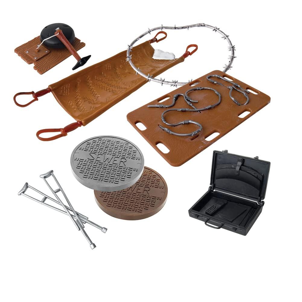 Enhance the realism of your wrestling action figure collection with this 8 Piece Accessory Set, packed with essential items to recreate intense and dramatic matches. This set includes a Time Keeper Bell with Hammer, a Briefcase, and a Stretcher for those high-stakes matches. Additionally, it comes with 2 Sewer Grates, a Barbed Wire Piece, a Barbed Wire Board, and a Pair of Crutches, providing all the tools needed for hardcore battles. Perfect for adding depth and variety to your wrestling setups, these accessories are a must-have for any fan looking to take their collection to the next level! Compatible with all wrestling action figures. Also a good scale for other 6-8 inch action figures.