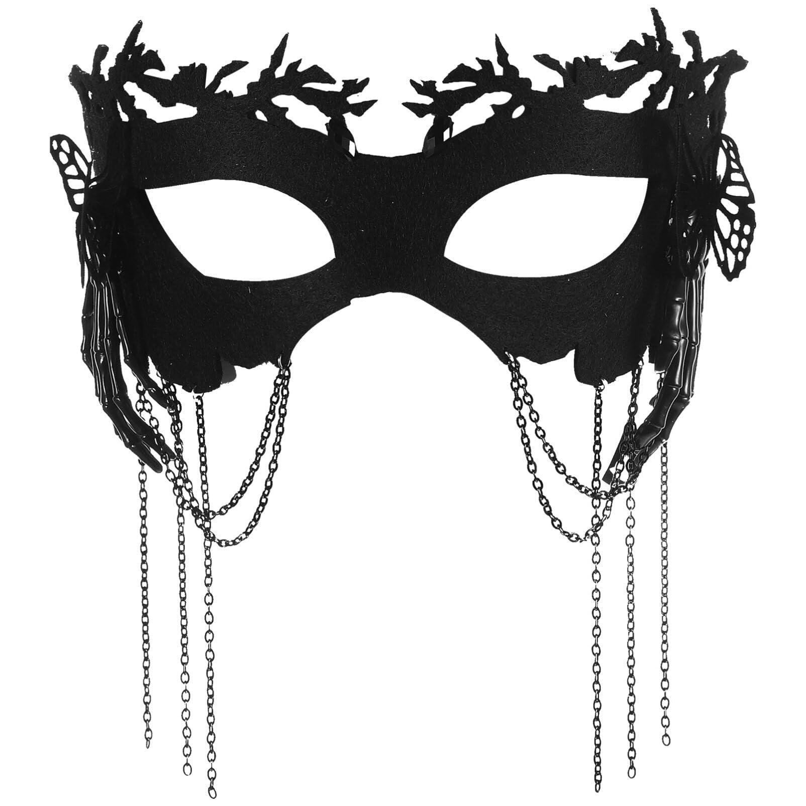 - Flowing tassels create a haunting effect. Skeleton hand decor design of this costume mask for a spooky touch