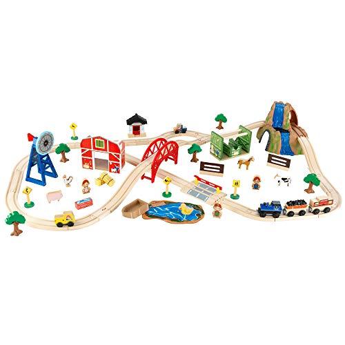 Life on the farm is a real adventure! The KidKraft Farm Train Set lets kids explore what its like to tend the animals, collect eggs and raise crops with 75 colorful rural-themed pieces. The train meanders through the serene waterfall, over the bridge and around the barn. Passengers catch a glimpse of the duck pond, complete with a yellow duck and rowboat. A stable houses a horse and cow and with bales of hay, and the windmill spins lazily in the breeze. This set is thoughtfully designed to provide years of imaginative fun.