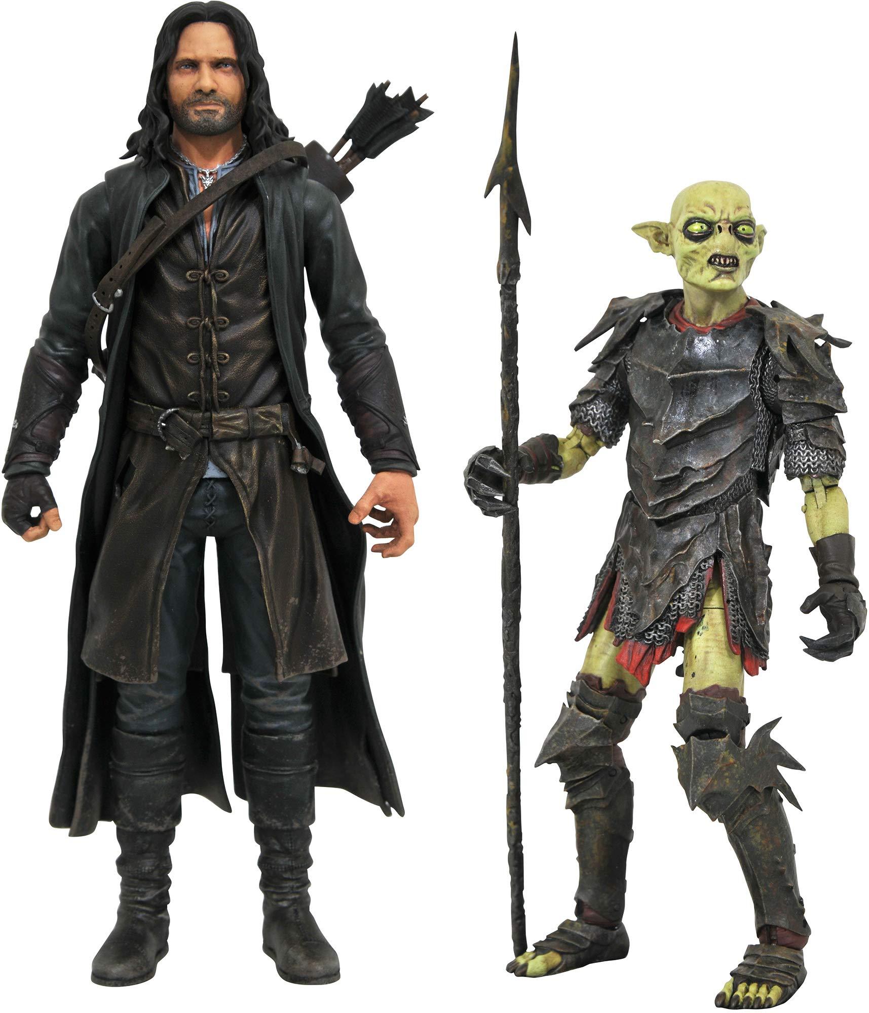 Name: Set of 2 (Aragorn - Moria Orc Category: Lord Of The Rings BAF Sauron Series: Deluxe Series 3 Type: Action Figure Size: 7 Inch Manufacturer: Diamond Description: A Diamond Select Toys release! The Evil one has risen! Complete your 13-inch build-a-figure of Sauron with this, the third series of Lord of the Rings Deluxe action figures! Aragorn and a Moria Orc are the two figures in this series, each with weapons and accessories - the orc even includes alternate heads so you can customize different orcs! Each 7-inch scale figure features multiple points of articulation, as well as detailed sculpting and paint applications. Each comes packaged in a full-color Deluxe window box. Designed by Eamon O'Donoghue, sculpted by Gentle Giant Studios! . LOTR Safety Warning: This product may contain sharp points, small parts that are choking hazards, and other elements that are not suitable for children under 3 years of age. We receive both US and Canadian Cases. You will get either English, bilingual or trilingual carded figures based on availability. Please understand this before ordering.