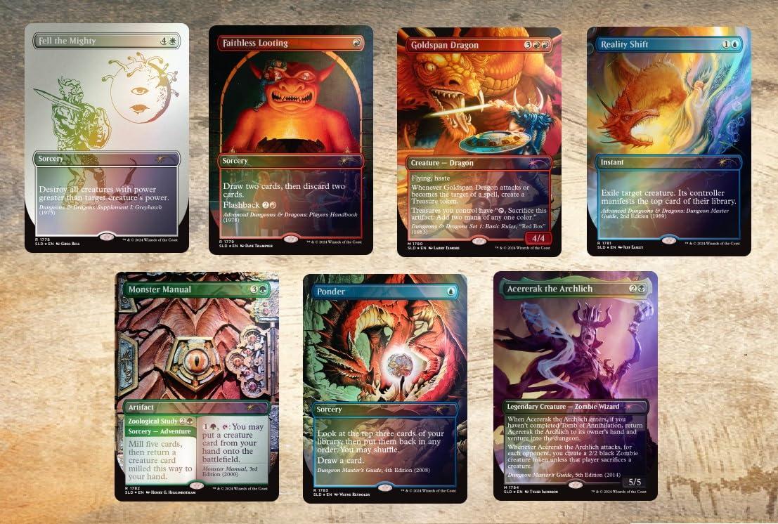 - Contents: 1x foil Fell the Mighty, 1x foil Faithless Looting, 1x foil Goldspan Dragon, 1x foil Reality Shift, 1x foil Monster Manual, 1x foil Ponder, 1x foil Acererak the Archlich