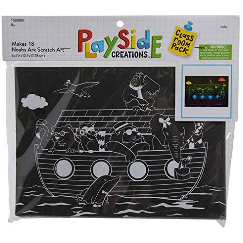 Make art that is bright, colorful, and super soft! Noah's Ark Scratch Art Craft Kit features an image of hip animals such as a beanie-wearing flamingo and a camera-carrying raccoon on a large ark. Its white design is created on a black background. Use the included sticks to turn this black and white image into a rainbow-colored, bold design!