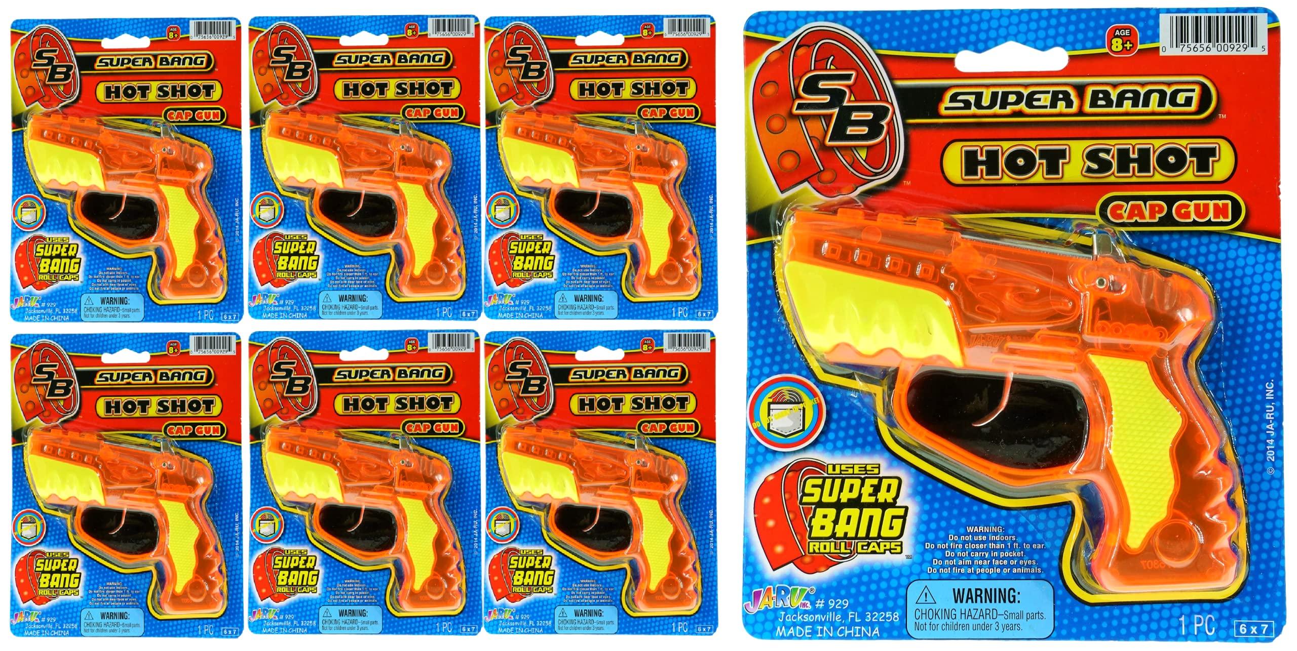 - 6 INDIVIDUALLY PACKED SUPER BANG CAP GUNS - An action-packed treat for wannabe sharpshooters! Cool plastic gun toys for kids and adults. Brightly colored orange cap gun. Plus one collectable JA-RU Bouncy Ball