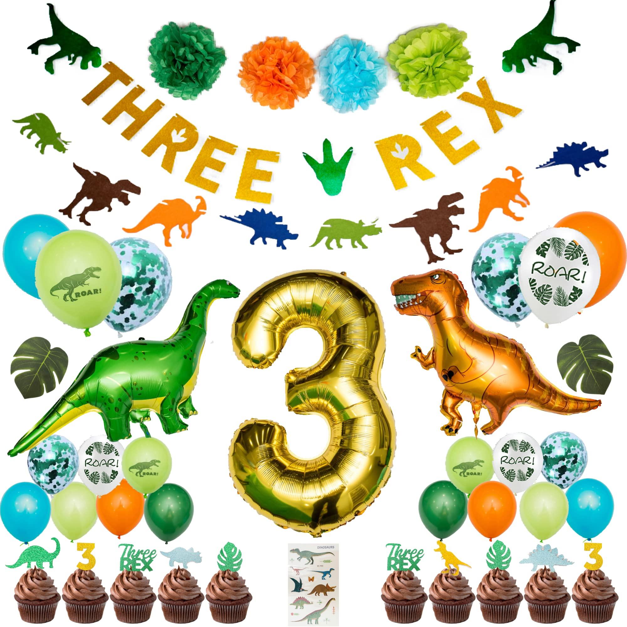 - What's Included? Our dinosaur decorations set comes with 2 dinosaur banners, 4 tissue paper pom poms, 25 latex balloons (5 confetti), 4 printed latex (2 ROAR, 2 T-REX), foil balloons (T-Rex, Long neck dino, #3), plastic palm leaves (2 large, 4 small), tattoos, "Three Rex" sparkle banner and 14 cupcake toppers.