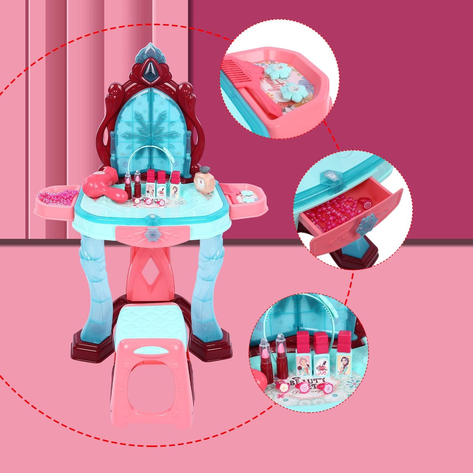 - [LARGE CAPACITY STORAGE] - The pretend dressing table toy has moulded storage compartments for cosmetics and accessories; the table also has pull-out drawers for organising beauty supplies and putting away miscellaneous items to keep it neat and organised.