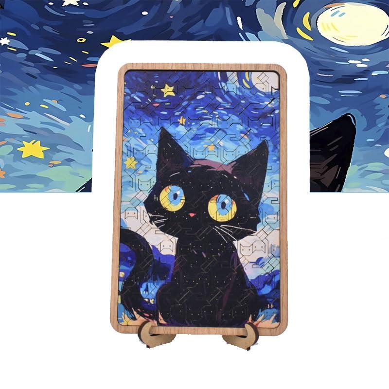 Image of a cat: In the center of the puzzle is a black cat with big, bright eyes, full of curiosity and agility. The cat's eyes are yellow in color, and there are blue details in the eyeballs, which makes it particularly eye-catching. The image of a black cat is simple but vivid, full of cartoon-style cuteness and humor. Background: The background is a night sky full of stars and moons, and the gradient of blue and purple makes the picture look very dreamy. The stars and moon in the background are dotted in between, adding a lot of fun and mystery to the whole picture.