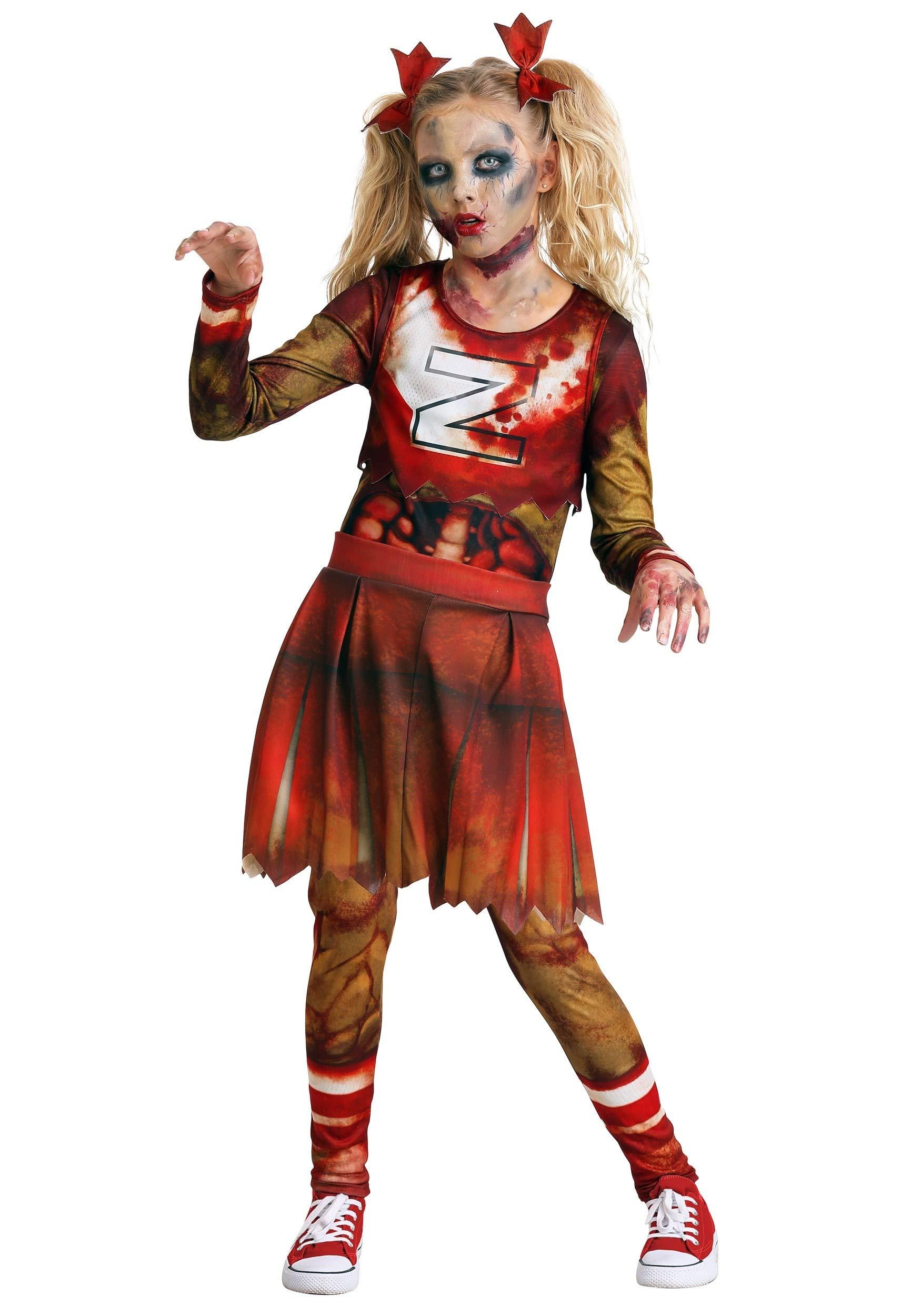 - DETAILS THAT MATTER: Girls Halloween costumes can be both cute and scary! This zombie cheerleading costume has a midrift that's illustrated with gore that will delight zombie kids. Fitted sleeves and leggings with zombie skin under the bloody cheerleader costume make this Halloween costume trick-or-treat ready!
